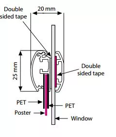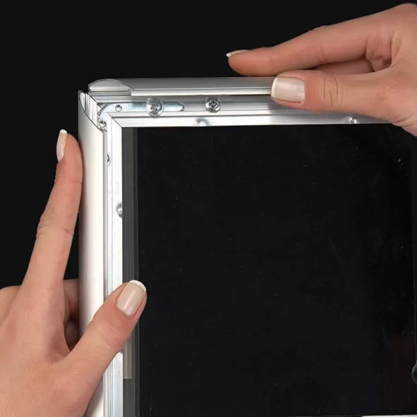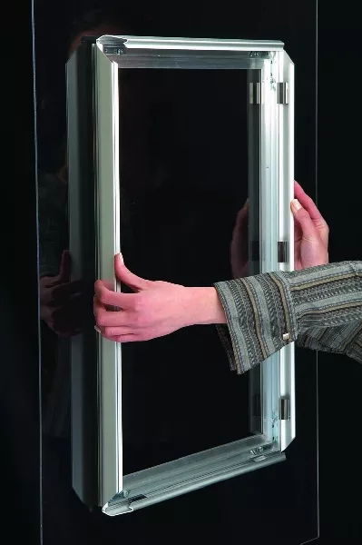 Der Klapprahmen Window Frame ist ideal für Schaufenster, da die Plakate von innen und außen sichtbar sind. Der Rahmen wird innen auf die Fensterscheibe geklebt, der Konterrahmen außen. Die zwei Plakate werden Rücken an Rücken eingelegt und innen getauscht.
