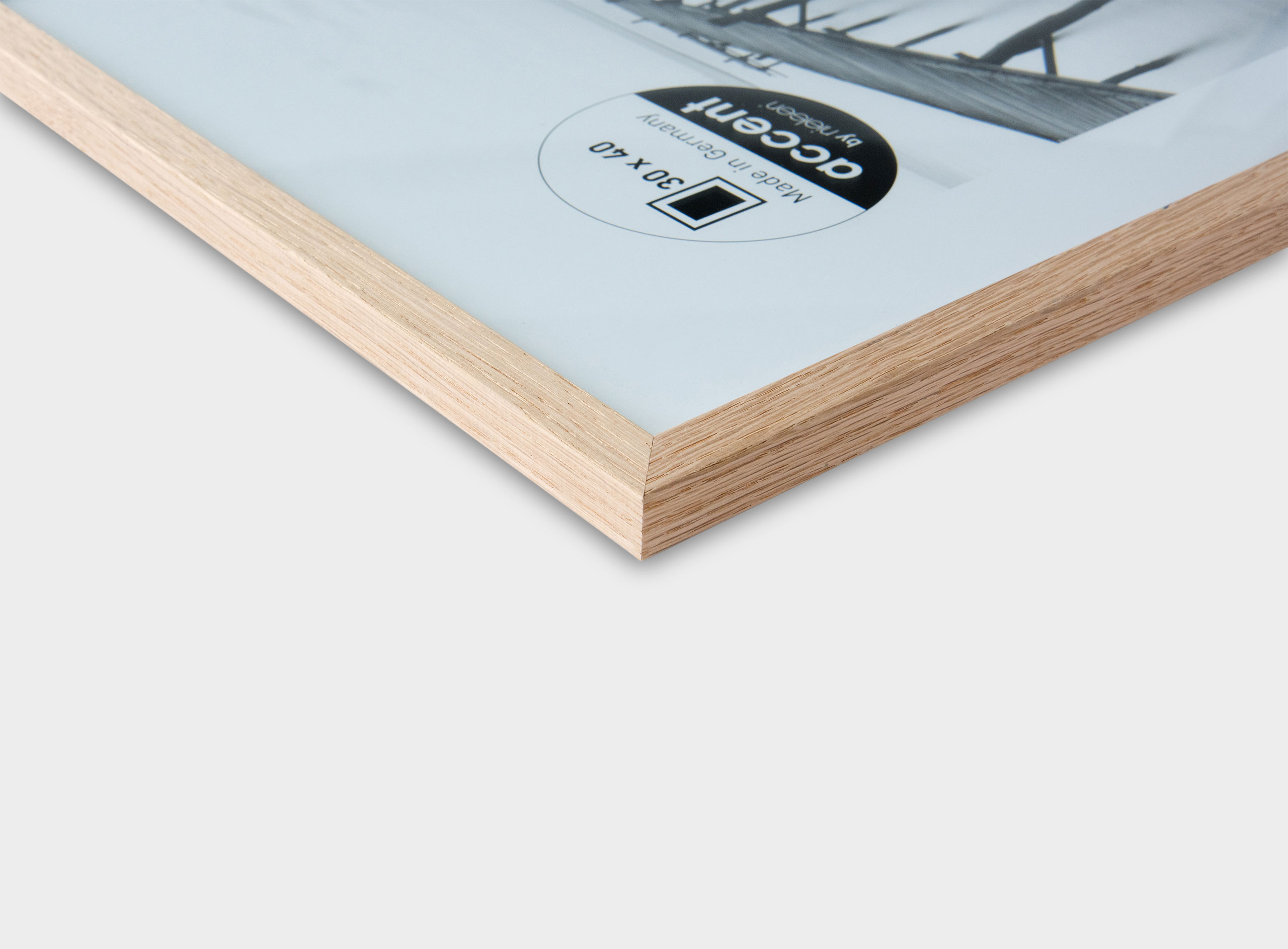 Der Accent Holz-Bilderrahmen Scandic von Nielsen Design ist ein zurückhaltender Rahmen im skandinavischem Design aus massiver Eiche zum Einrahmen von Bildern, Dokumenten, Fotos und mehr. Der Rahmen wird in Deutschland gefertigt und kommt mit einer MDF Rückwand. Außerdem ist die Rückwand mit Aufhänger Hoch und Quer ausgestattet. Ein Tischaufsteller wird bis 18 x 24 cm bereitgestellt. Durch eine Einlegehöhe von 3 mm eignet sich der Rahmen für ein passendes Passepartout, welches sie ebenfalls in unserem Onlineshop bekommen. Im Format 70 x 100 cm wird der Rahmen aus Stabilitätsgründen mit einer Profilbreite von 20 mm geliefert