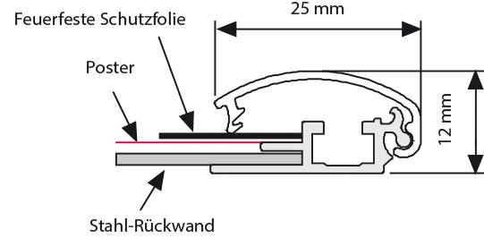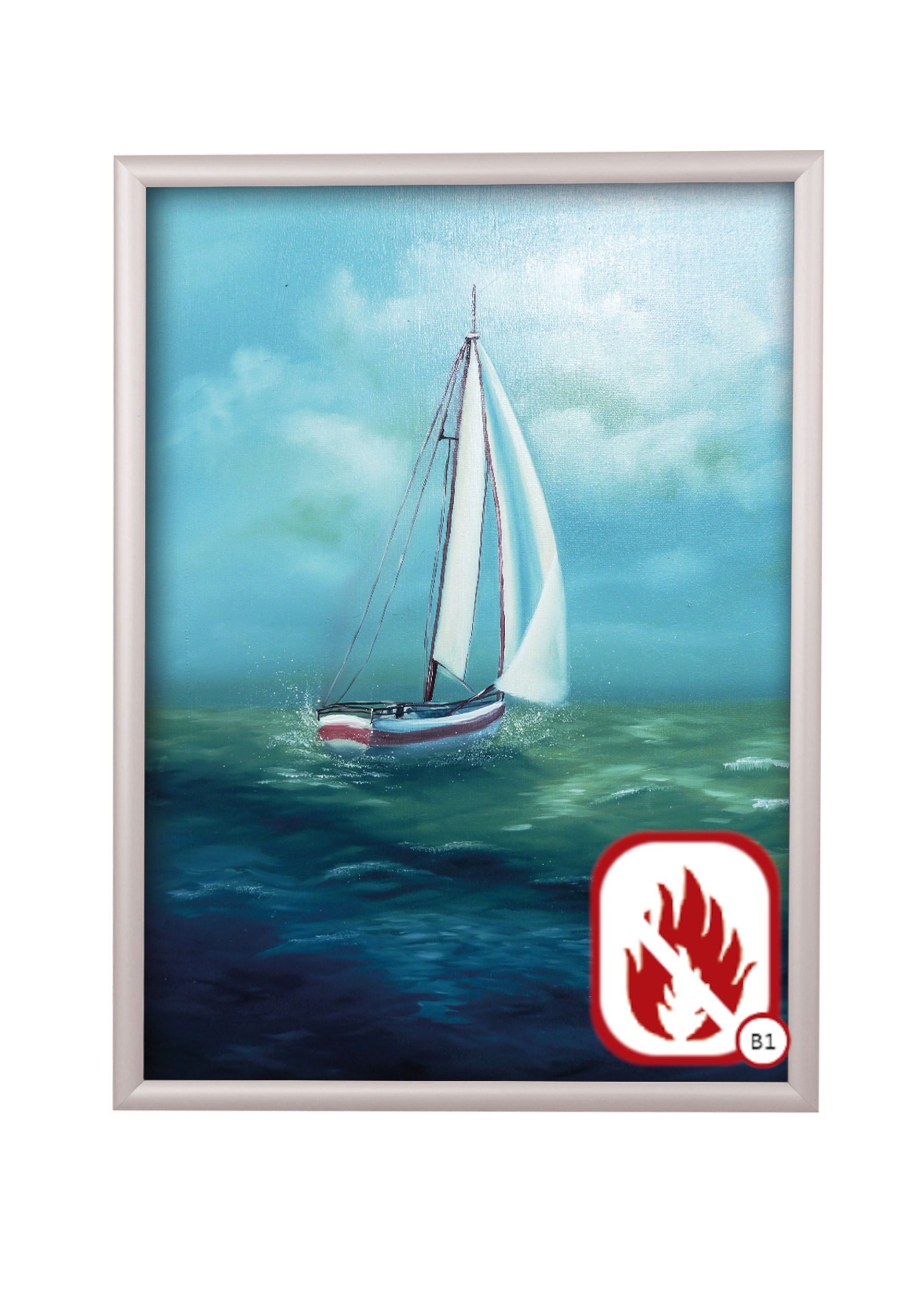 Der Klapprahmen Fire Protection ist feuerfest gemäß Brandschutznorm B1 und bietet mit seinem silber und schwarz eloxiertem Aluminium Rahmenprofil auch optisch ein Highlight. Dadurch eignet er sich vor allem für öffentliche Behörden, Schulen, und überall da, wo Brandschutzrichtlinien einzuhalten sind.